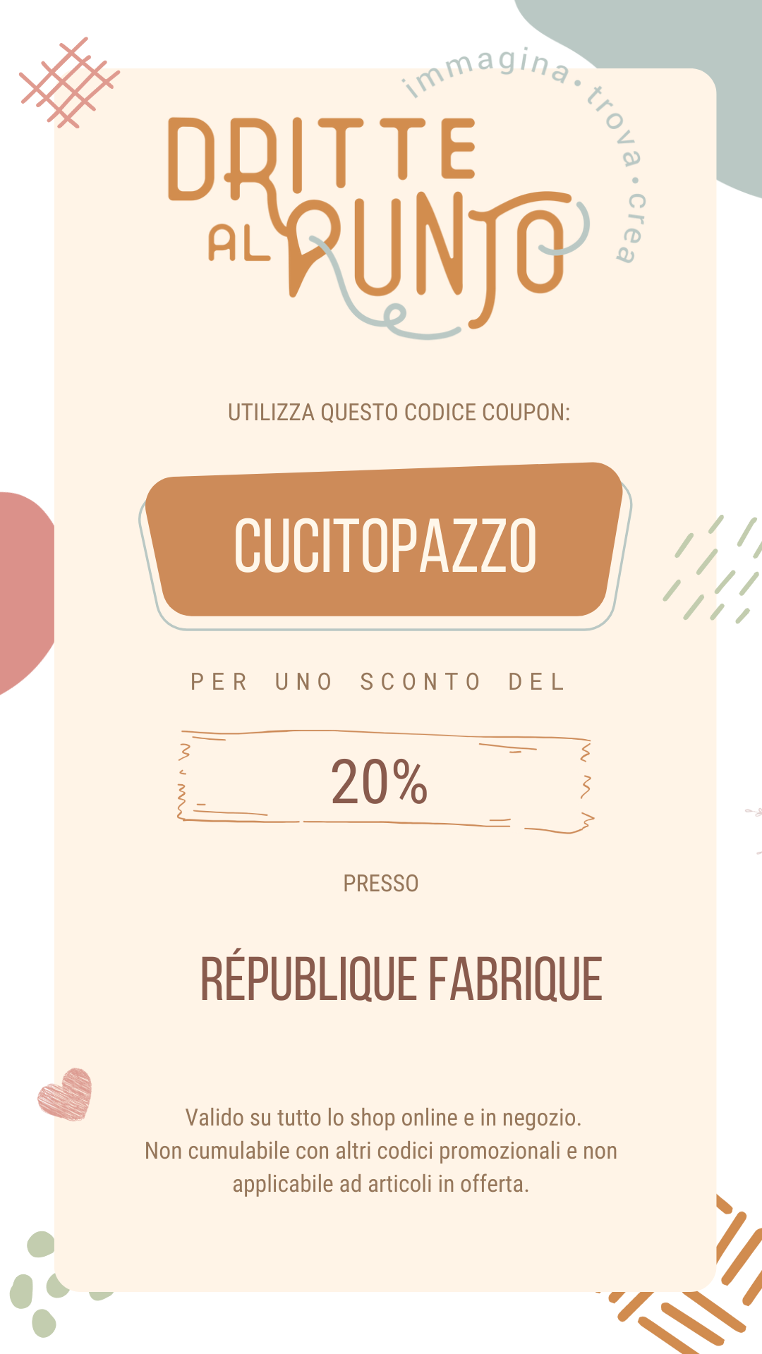 Utilizza il coupon CUCITOPAZZO per usufruire del 20% di sconto su tutto lo shop online e in negozio. Non cumulabile con altri codici promozionali e non applicabile ad articoli in offerta.